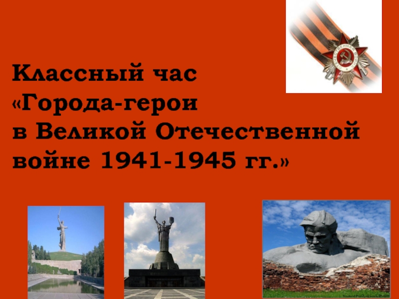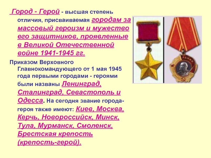 Приказом Верховного Главнокомандующего от 1 мая 1945 года первыми городами - героями были названы Ленинград, Сталинград, Севастополь и Одесса. На сегодня звание города-героя также имеют: Киев, Москва, Керчь, Новороссийск, Минск, Тула, Мурманск, Смоленск, Брестская крепость (крепость-герой).