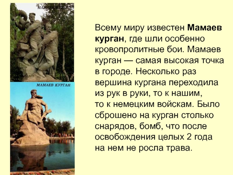 Слайд 18Всему миру известен Мамаев курган, где шли особенно кровопролитные бои. Мамаев