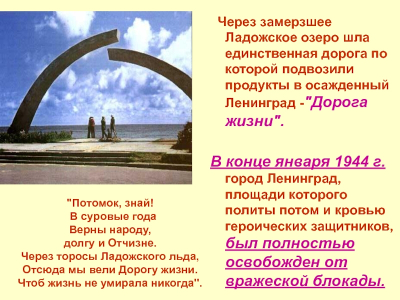 Слайд 10 Через замерзшее Ладожское озеро шла единственная дорога по которой подвозили