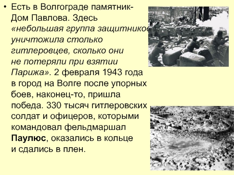 Слайд 17Есть в Волгограде памятник- Дом Павлова. Здесь «небольшая группа защитников уничтожила