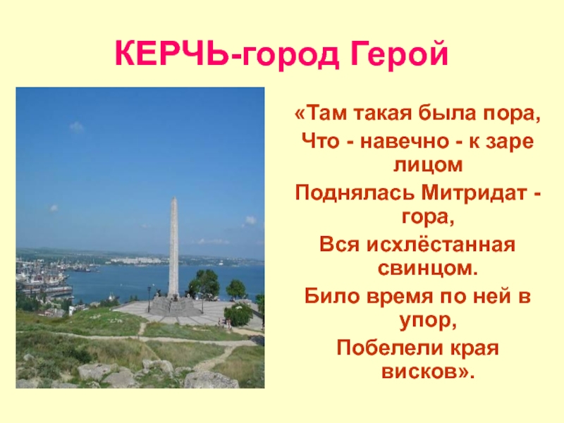 и после упорных боев освободили его. Победное знамя взвилось на горе Митридат, там, где ныне высится гранитная стрела обелиска Славы и горит Вечный огонь в память павших и в честь живых, тех, кто здесь, на керченской земле, отстаивал свободу и независимость нашей Родины.