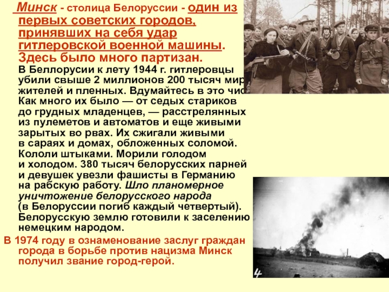 городов, принявших на себя удар гитлеровской военной машины. Здесь было много партизан. В Беллорусии к лету 1944 г. гитлеровцы убили свыше 2 миллионов 200 тысяч мирных жителей и пленных. Вдумайтесь в это число. Как много их было — от седых стариков до грудных младенцев, — расстрелянных из пулеметов и автоматов и еще живыми зарытых во рвах. Их сжигали живыми в сараях и домах, обложенных соломой. Кололи штыками. Морили голодом и холодом. 380 тысяч белорусских парней и девушек увезли фашисты в Германию на рабскую работу. Шло планомерное уничтожение белорусского народа (в Белоруссии погиб каждый четвертый). Белорусскую землю готовили к заселению немецким народом.