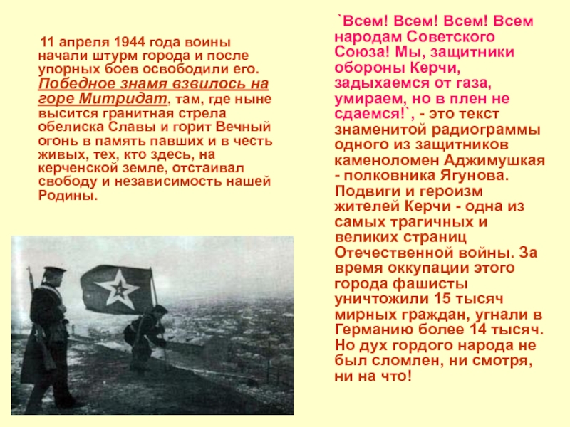 `Всем! Всем! Всем! Всем народам Советского Союза! Мы, защитники обороны Керчи, задыхаемся от газа, умираем, но в плен не сдаемся!`, - это текст знаменитой радиограммы одного из защитников каменоломен Аджимушкая - полковника Ягунова. Подвиги и героизм жителей Керчи - одна из самых трагичных и великих страниц Отечественной войны. За время оккупации этого города фашисты уничтожили 15 тысяч мирных граждан, угнали в Германию более 14 тысяч. Но дух гордого народа не был сломлен, ни смотря, ни на что!