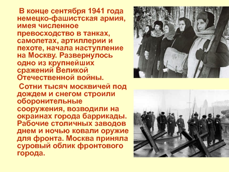 Сотни тысяч москвичей под дождем и снегом строили оборонительные сооружения, возводили на окраинах города баррикады. Рабочие столичных заводов днем и ночью ковали оружие для фронта. Москва приняла суровый облик фронтового города.