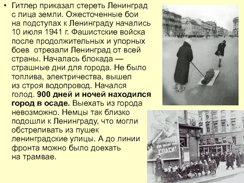 10 июля 1941 г. Фашистские войска после продолжительных и упорных боев отрезали Ленинград от всей страны. Началась блокада — страшные дни для города. Не было топлива, электричества, вышел из строя водопровод. Начался голод. 900 дней и ночей находился город в осаде. Выехать из города невозможно. Немцы так близко подошли к Ленинграду, что могли обстреливать из пушек ленинградские улицы. А до линии фронта можно было доехать на трамвае.