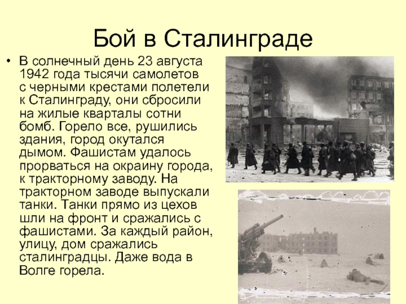 полетели к Сталинграду, они сбросили на жилые кварталы сотни бомб. Горело все, рушились здания, город окутался дымом. Фашистам удалось прорваться на окраину города, к тракторному заводу. На тракторном заводе выпускали танки. Танки прямо из цехов шли на фронт и сражались с фашистами. За каждый район, улицу, дом сражались сталинградцы. Даже вода в Волге горела.