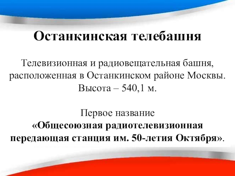 Телевизионная и радиовещательная башня, расположенная в Останкинском районе Москвы. Высота – 540,1 м.