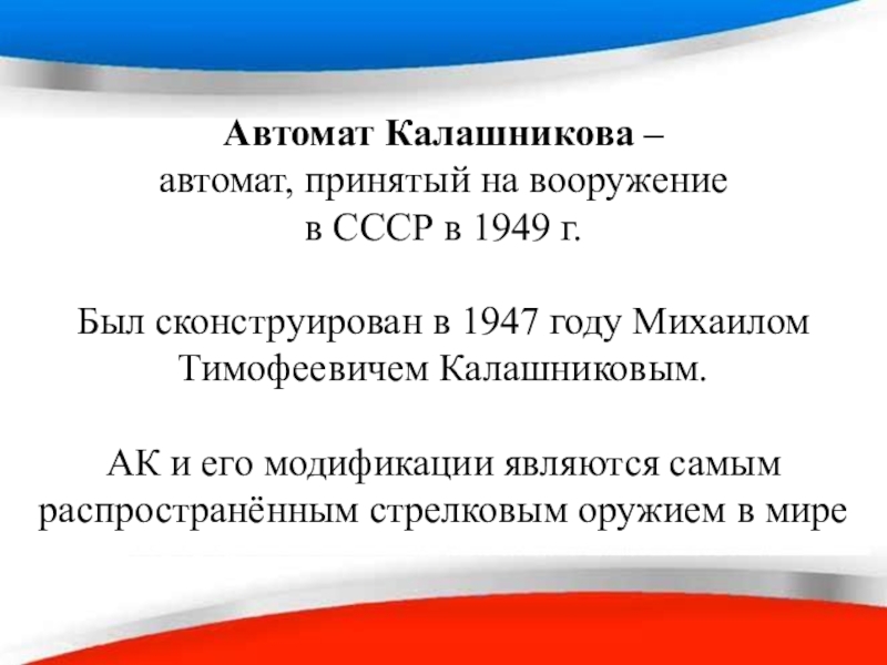 Слайд 42Автомат Калашникова –