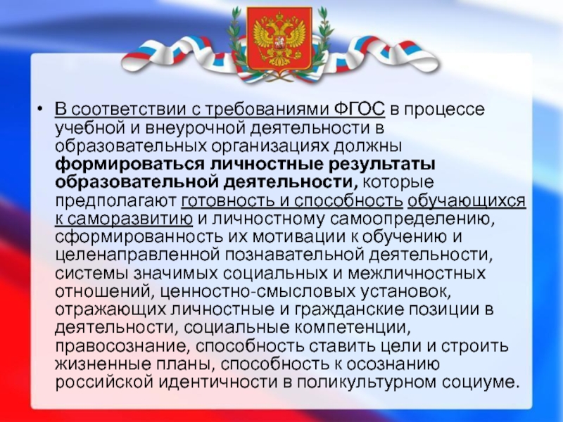 в образовательных организациях должны формироваться личностные результаты образовательной деятельности, которые предполагают готовность и способность обучающихся к саморазвитию и личностному самоопределению, сформированность их мотивации к обучению и целенаправленной познавательной деятельности, системы значимых социальных и межличностных отношений, ценностно-смысловых установок, отражающих личностные и гражданские позиции в деятельности, социальные компетенции, правосознание, способность ставить цели и строить жизненные планы, способность к осознанию российской идентичности в поликультурном социуме.