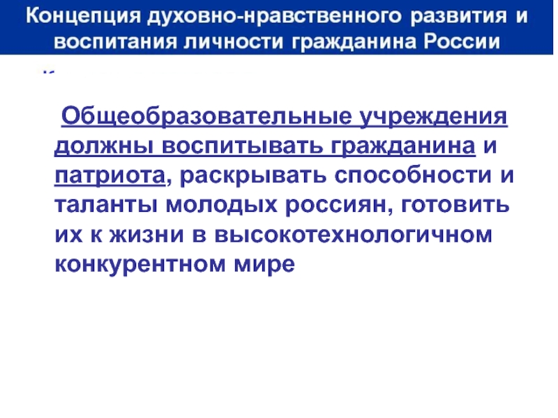 Слайд 7 Общеобразовательные учреждения должны воспитывать гражданина и патриота, раскрывать способности и таланты