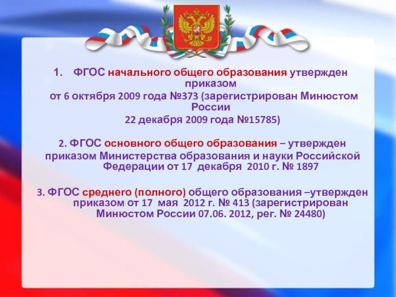 3. ФГОС среднего (полного) общего образования –утвержден приказом от 17 мая 2012 г. № 413 (зарегистрирован Минюстом России 07.06. 2012, рег. № 24480)
