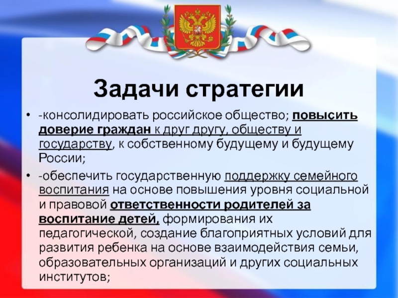 -обеспечить государственную поддержку семейного воспитания на основе повышения уровня социальной и правовой ответственности родителей за воспитание детей, формирования их педагогической, создание благоприятных условий для развития ребенка на основе взаимодействия семьи, образовательных организаций и других социальных институтов;