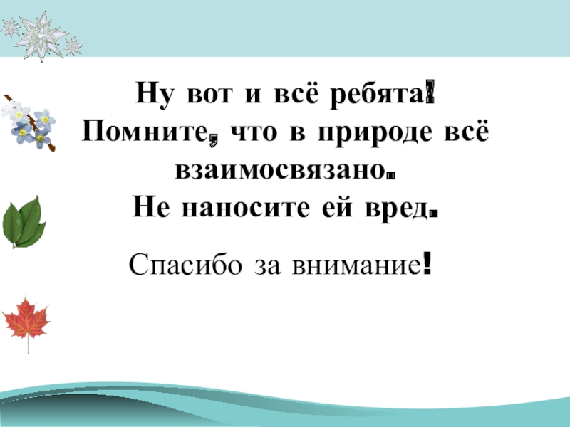 г/ вспомню слова учителя: «Всё в природе взаимосвязано. Уничтожая одно, вы приносите вред многим.»