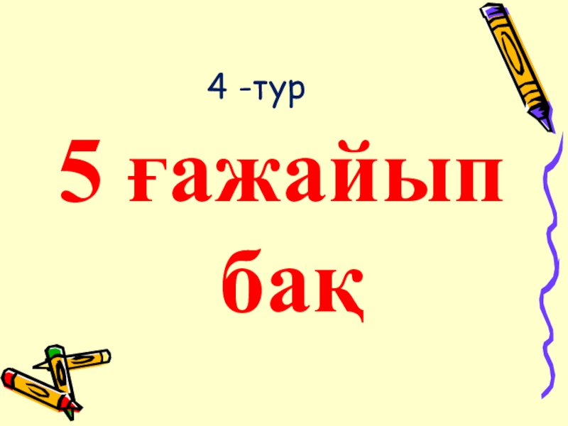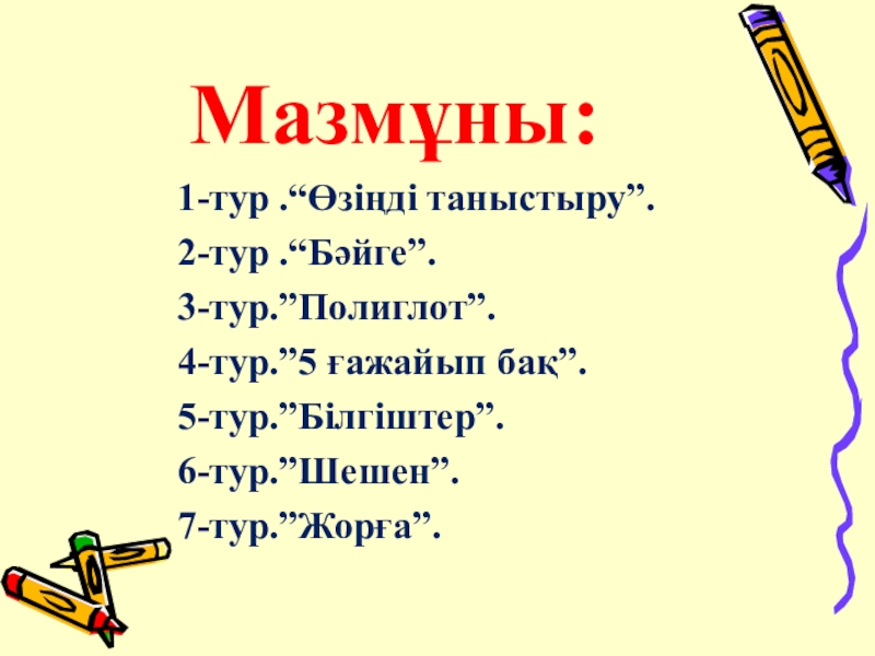Мазмұны:1-тур .“Өзіңді таныстыру”.2-тур .“Бәйге”.3-тур.”Полиглот”.4-тур.”5 ғажайып бақ”.5-тур.”Білгіштер”.6-тур.”Шешен”.7-тур.”Жорға”.