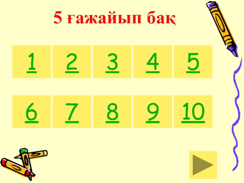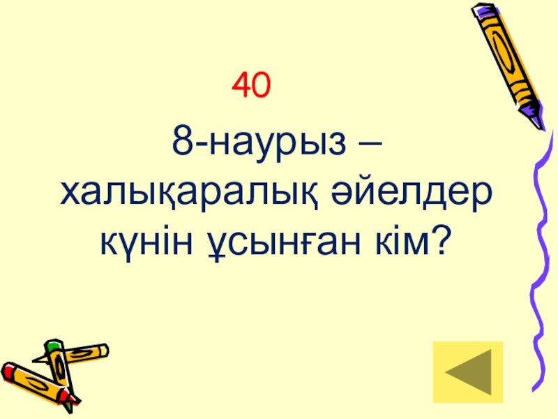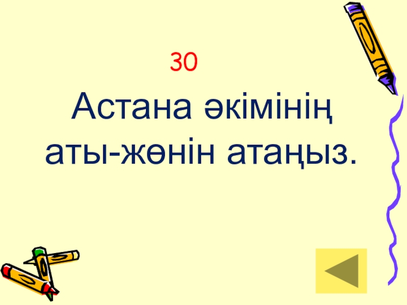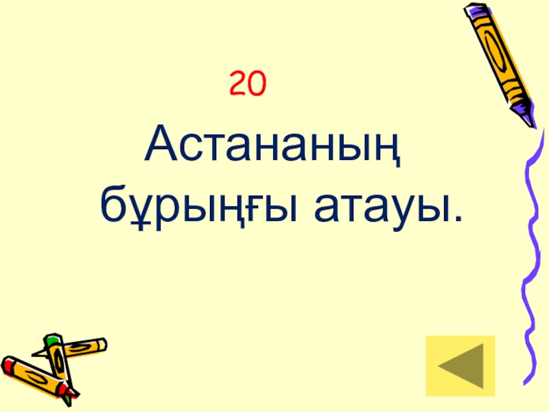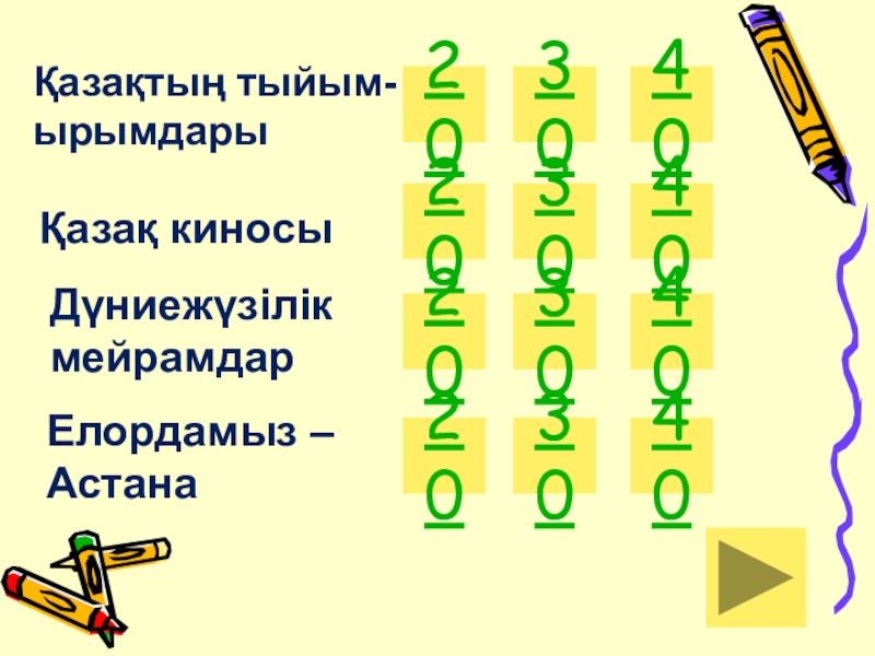 20Қазақтың тыйым-ырымдарыҚазақ киносы3040Дүниежүзілік мейрамдарЕлордамыз – Астана203040203040203040
