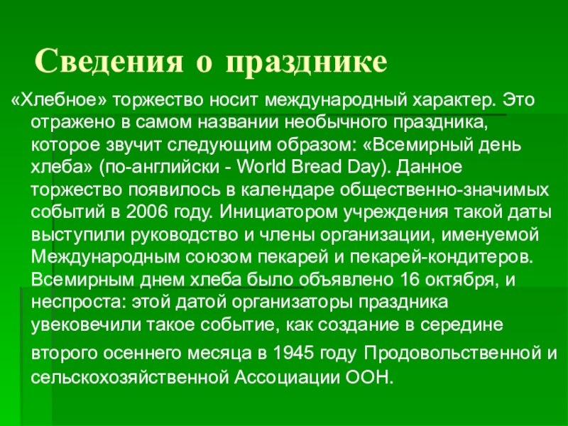 названии необычного праздника, которое звучит следующим образом: «Всемирный день хлеба» (по-английски - World Bread Day). Данное торжество появилось в календаре общественно-значимых событий в 2006 году. Инициатором учреждения такой даты выступили руководство и члены организации, именуемой Международным союзом пекарей и пекарей-кондитеров. Всемирным днем хлеба было объявлено 16 октября, и неспроста: этой датой организаторы праздника увековечили такое событие, как создание в середине второго осеннего месяца в 1945 году Продовольственной и сельскохозяйственной Ассоциации ООН.
