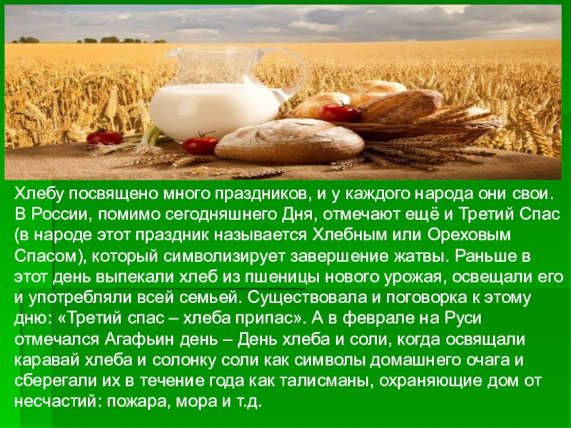 России, помимо сегодняшнего Дня, отмечают ещё и Третий Спас (в народе этот праздник называется Хлебным или Ореховым Спасом), который символизирует завершение жатвы. Раньше в этот день выпекали хлеб из пшеницы нового урожая, освещали его и употребляли всей семьей. Существовала и поговорка к этому дню: «Третий спас – хлеба припас». А в феврале на Руси отмечался Агафьин день – День хлеба и соли, когда освящали каравай хлеба и солонку соли как символы домашнего очага и сберегали их в течение года как талисманы, охраняющие дом от несчастий: пожара, мора и т.д.