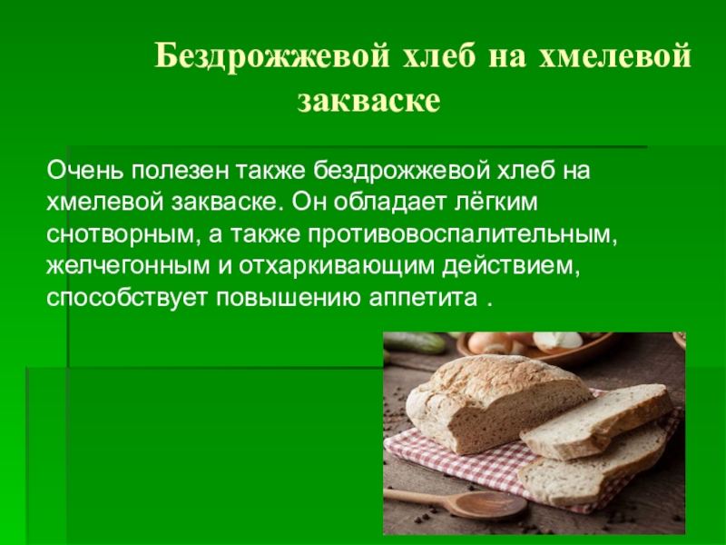 также бездрожжевой хлеб на хмелевой закваске. Он обладает лёгким снотворным, а также противовоспалительным, желчегонным и отхаркивающим действием, способствует повышению аппетита .