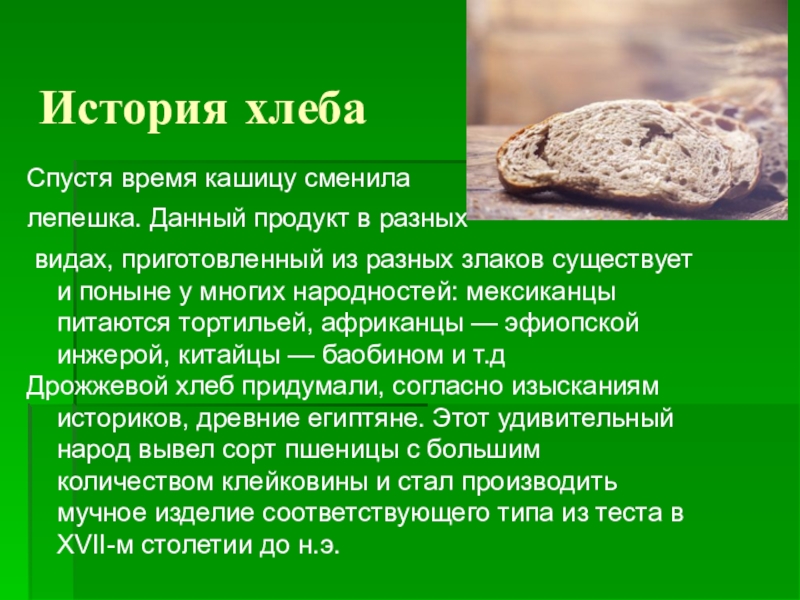 из разных злаков существует и поныне у многих народностей: мексиканцы питаются тортильей, африканцы — эфиопской инжерой, китайцы — баобином и т.д