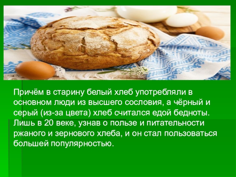 сословия, а чёрный и серый (из-за цвета) хлеб считался едой бедноты. Лишь в 20 веке, узнав о пользе и питательности ржаного и зернового хлеба, и он стал пользоваться большей популярностью.