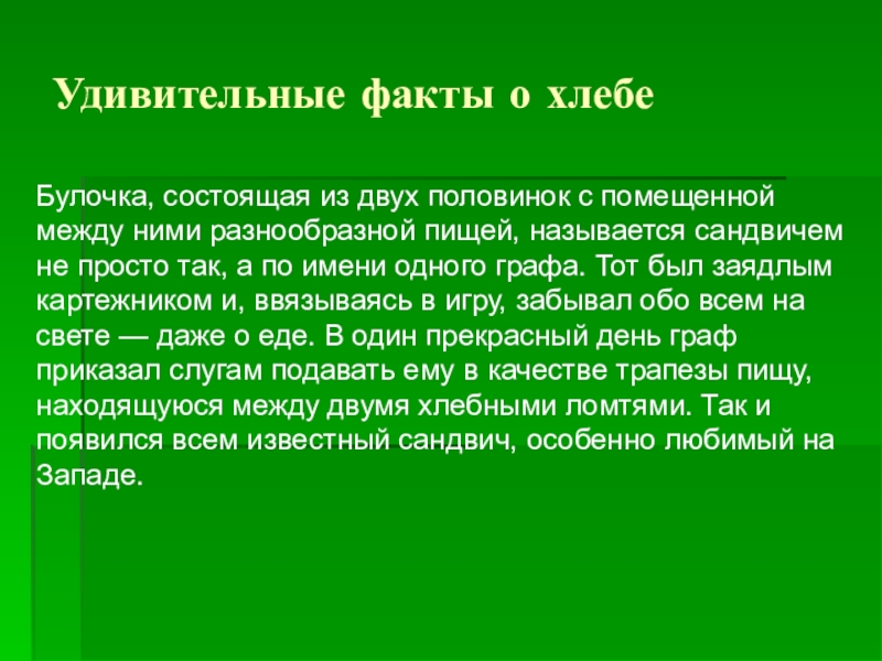 ними разнообразной пищей, называется сандвичем не просто так, а по имени одного графа. Тот был заядлым картежником и, ввязываясь в игру, забывал обо всем на свете — даже о еде. В один прекрасный день граф приказал слугам подавать ему в качестве трапезы пищу, находящуюся между двумя хлебными ломтями. Так и появился всем известный сандвич, особенно любимый на Западе.