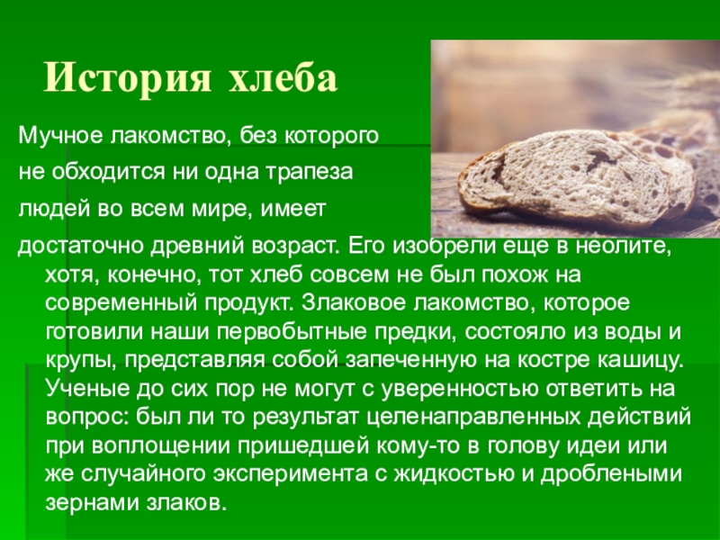 достаточно древний возраст. Его изобрели еще в неолите, хотя, конечно, тот хлеб совсем не был похож на современный продукт. Злаковое лакомство, которое готовили наши первобытные предки, состояло из воды и крупы, представляя собой запеченную на костре кашицу. Ученые до сих пор не могут с уверенностью ответить на вопрос: был ли то результат целенаправленных действий при воплощении пришедшей кому-то в голову идеи или же случайного эксперимента с жидкостью и дроблеными зернами злаков.