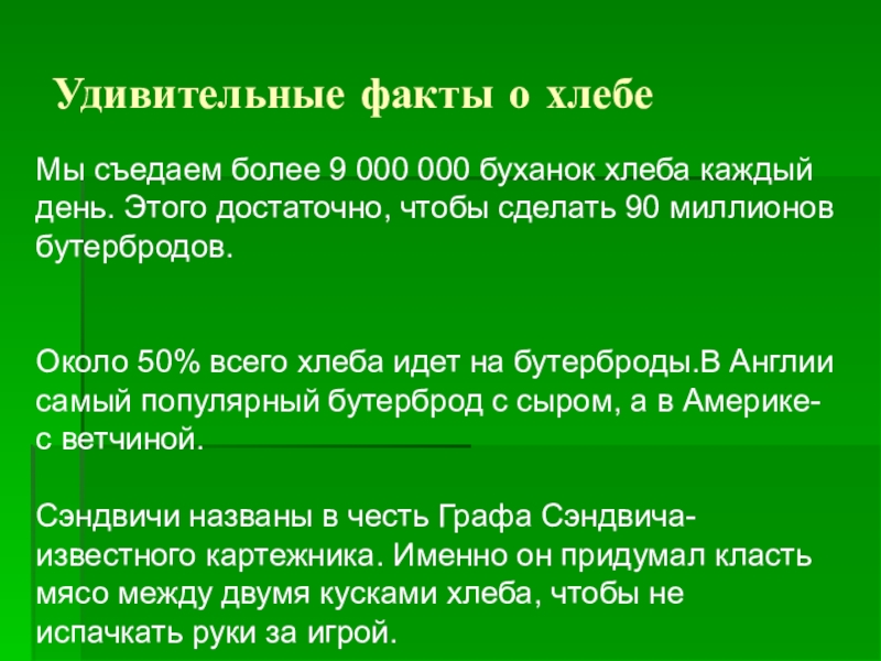 Около 50% всего хлеба идет на бутерброды.В Англии самый популярный бутерброд с сыром, а в Америке- с ветчиной.
