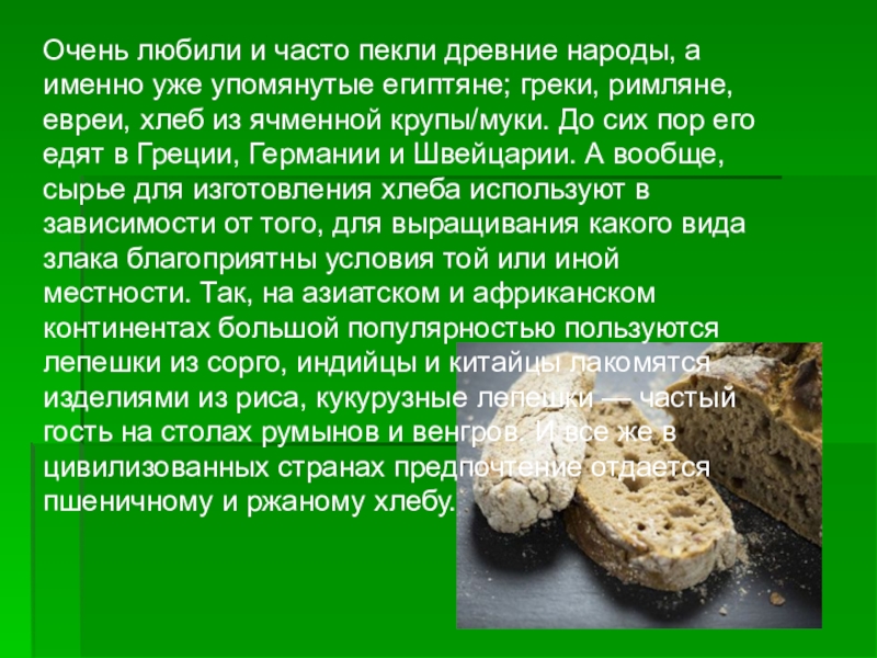 египтяне; греки, римляне, евреи, хлеб из ячменной крупы/муки. До сих пор его едят в Греции, Германии и Швейцарии. А вообще, сырье для изготовления хлеба используют в зависимости от того, для выращивания какого вида злака благоприятны условия той или иной местности. Так, на азиатском и африканском континентах большой популярностью пользуются лепешки из сорго, индийцы и китайцы лакомятся изделиями из риса, кукурузные лепешки — частый гость на столах румынов и венгров. И все же в цивилизованных странах предпочтение отдается пшеничному и ржаному хлебу.