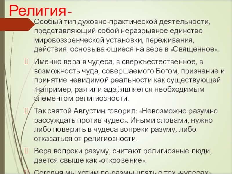 Именно вера в чудеса, в сверхъестественное, в возможность чуда, совершаемого Богом, признание и принятие невидимой реальности как существующей (например, рая или ада) является необходимым элементом религиозности.