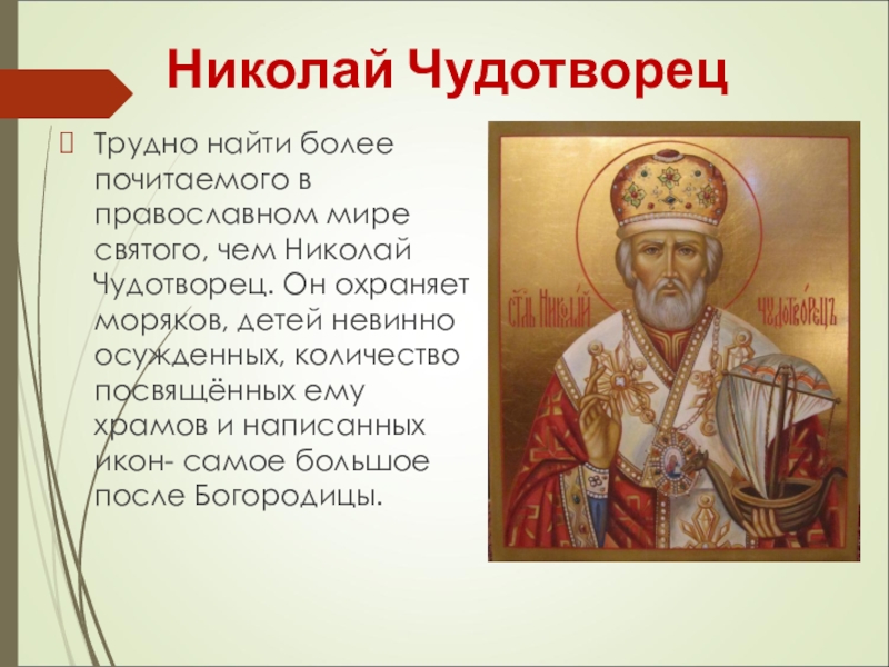 Чудотворец. Он охраняет моряков, детей невинно осужденных, количество посвящённых ему храмов и написанных икон- самое большое после Богородицы.