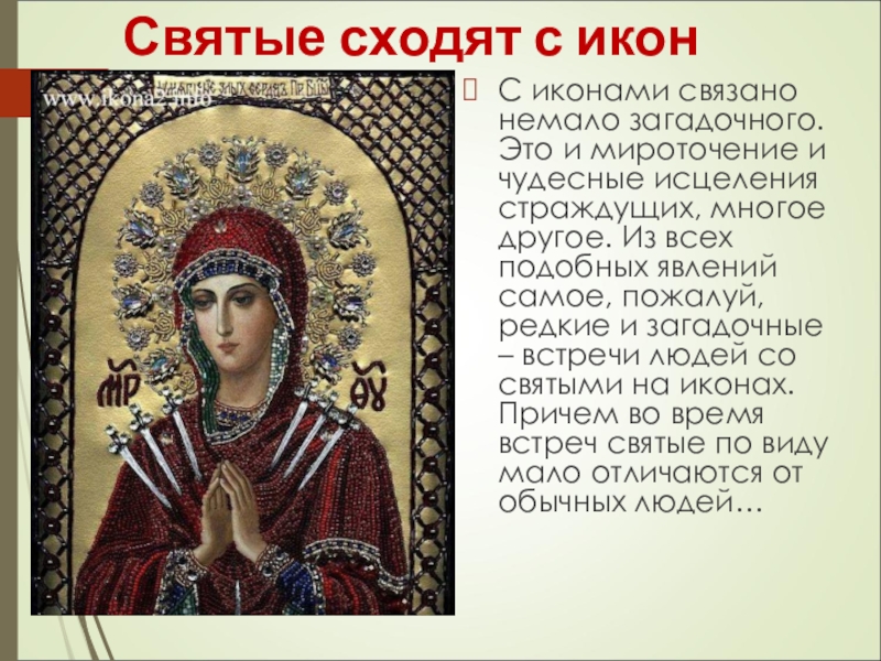 и чудесные исцеления страждущих, многое другое. Из всех подобных явлений самое, пожалуй, редкие и загадочные – встречи людей со святыми на иконах. Причем во время встреч святые по виду мало отличаются от обычных людей…