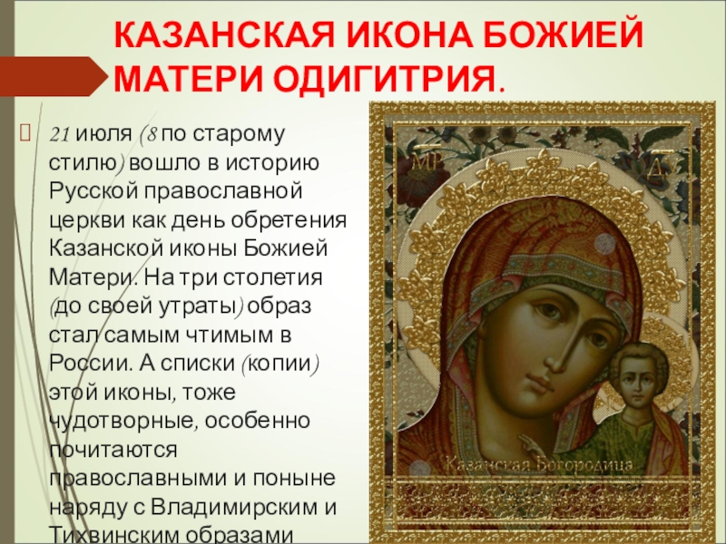 Слайд 16КАЗАНСКАЯ ИКОНА БОЖИЕЙ МАТЕРИ ОДИГИТРИЯ.