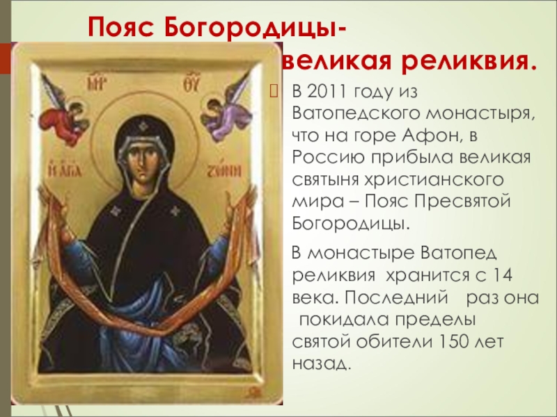 В 2011 году из Ватопедского монастыря, что на горе Афон, в Россию прибыла великая святыня христианского мира – Пояс Пресвятой Богородицы.