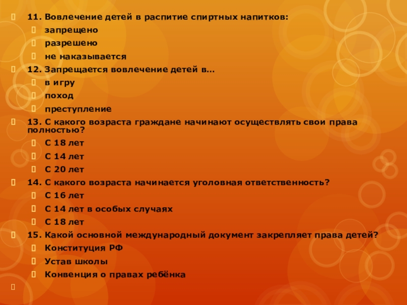 11. Вовлечение детей в распитие спиртных напитков: запрещеноразрешеноне наказывается12. Запрещается вовлечение детей в… в игру походпреступление13. С