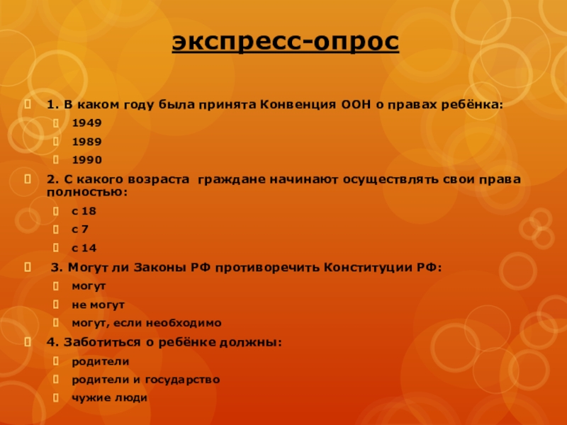экспресс-опрос1. В каком году была принята Конвенция ООН о правах ребёнка: 1949198919902. С какого возраста  граждане начинают