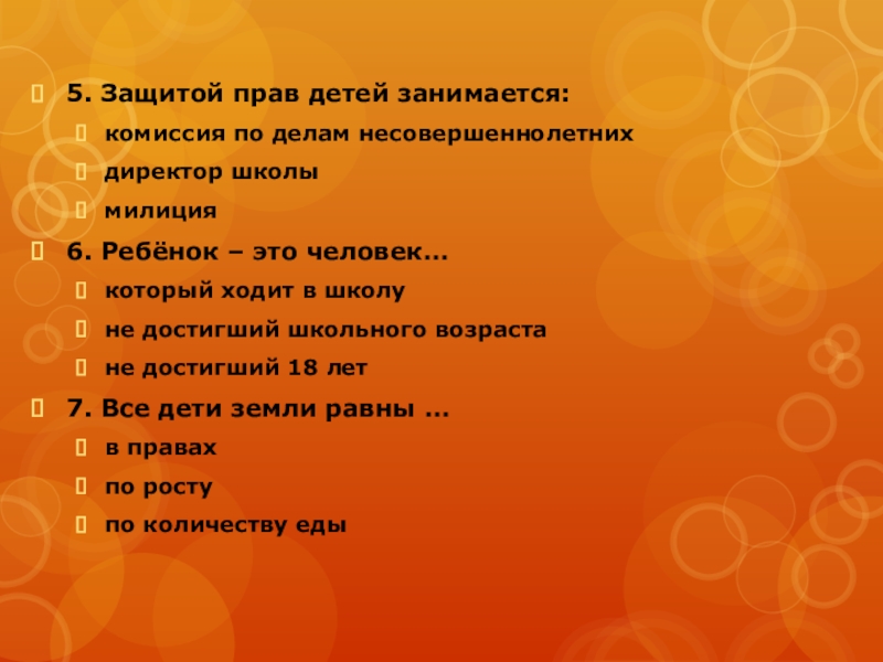 5. Защитой прав детей занимается: комиссия по делам несовершеннолетнихдиректор школымилиция6. Ребёнок – это человек… который ходит в