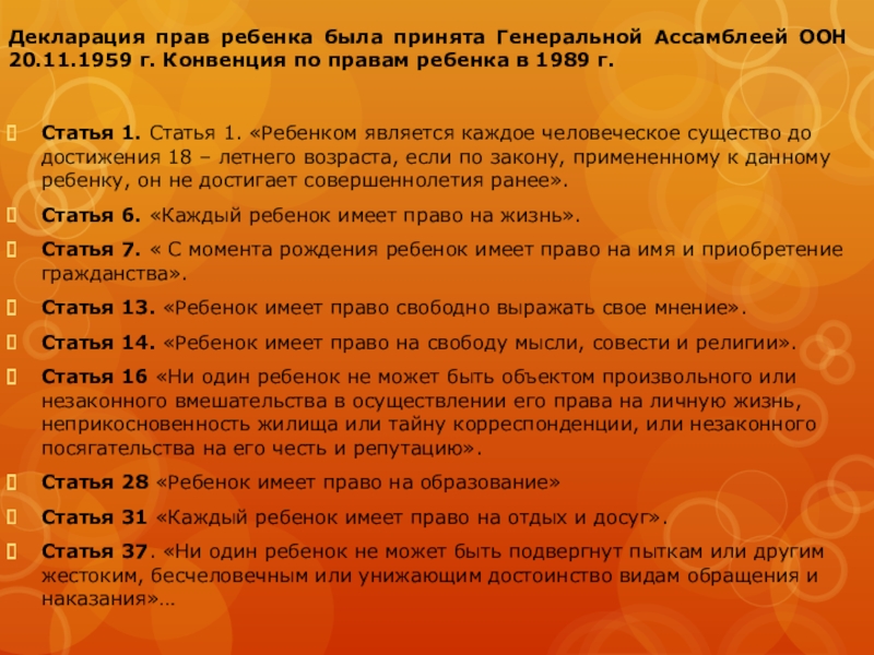 Декларация прав ребенка была принята Генеральной Ассамблеей ООН  20.11.1959 г. Конвенция по правам ребенка в 1989 г.Статья 1. Статья 1. «Ребенком является каждое человеческое существо до достижения 18 – летнего возраста, если по закону, примененному к
