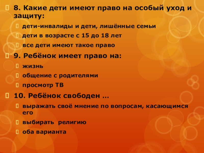 8. Какие дети имеют право на особый уход и защиту: дети-инвалиды и дети, лишённые семьидети в возрасте