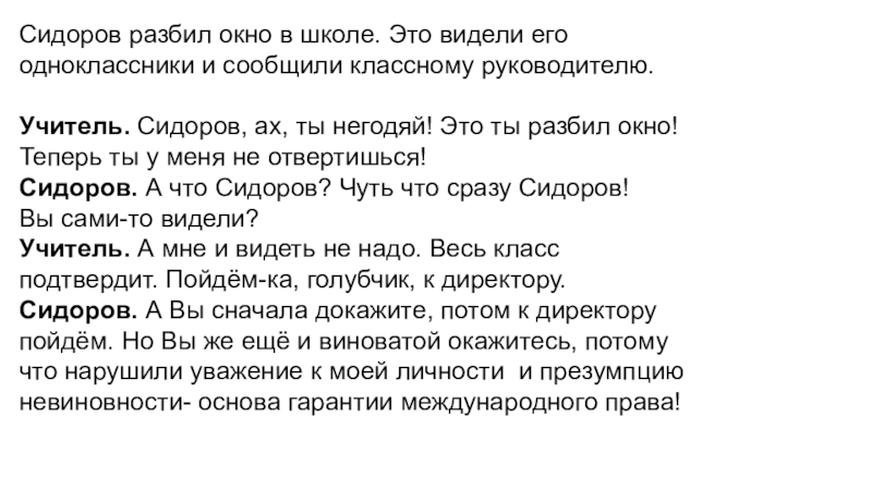 Сидоров. А Вы сначала докажите, потом к директору пойдём. Но Вы же ещё и виноватой окажитесь, потому что нарушили уважение к моей личности и презумпцию невиновности- основа гарантии международного права!