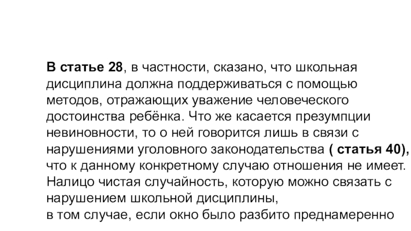 с помощью методов, отражающих уважение человеческого достоинства ребёнка. Что же касается презумпции невиновности, то о ней говорится лишь в связи с нарушениями уголовного законодательства ( статья 40), что к данному конкретному случаю отношения не имеет. Налицо чистая случайность, которую можно связать с нарушением школьной дисциплины,