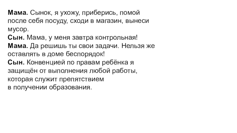 Слайд 18Мама. Сынок, я ухожу, приберись, помой после себя посуду, сходи в