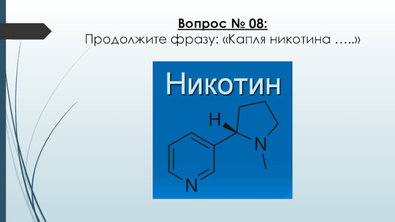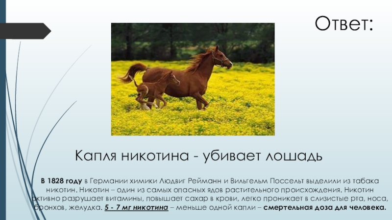 Рейманн и Вильгельм Поссельт выделили из табака никотин. Никотин – один из самых опасных ядов растительного происхождения. Никотин активно разрушает витамины, повышает сахар в крови, легко проникает в слизистые рта, носа, бронхов, желудка. 5 - 7 мг никотина – меньше одной капли – смертельная доза для человека.