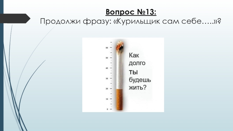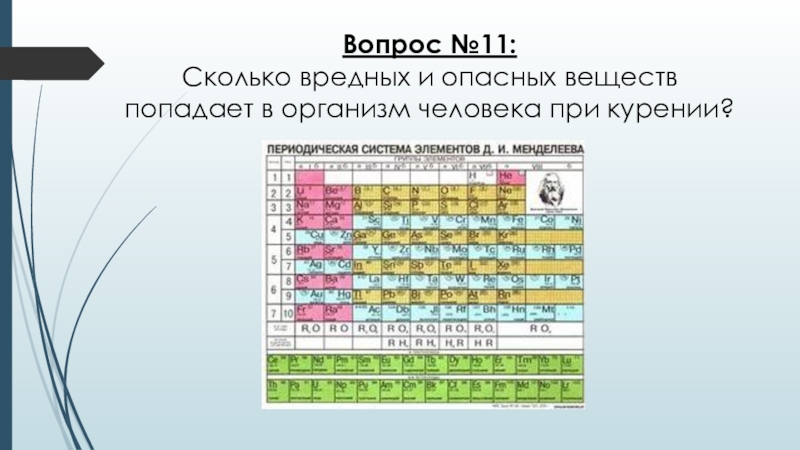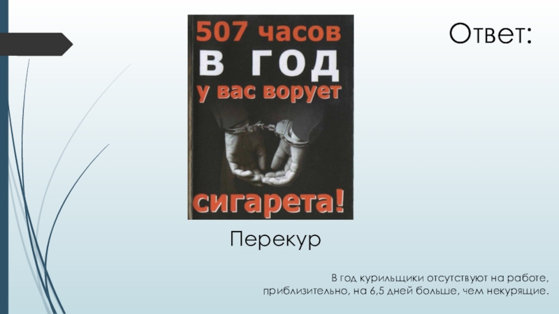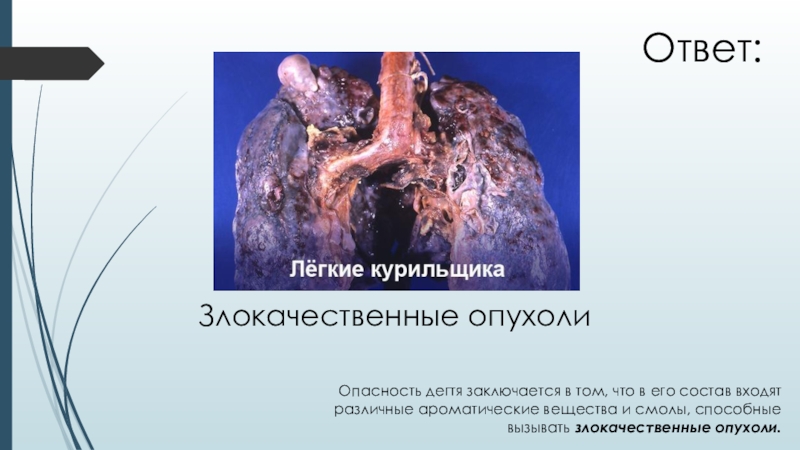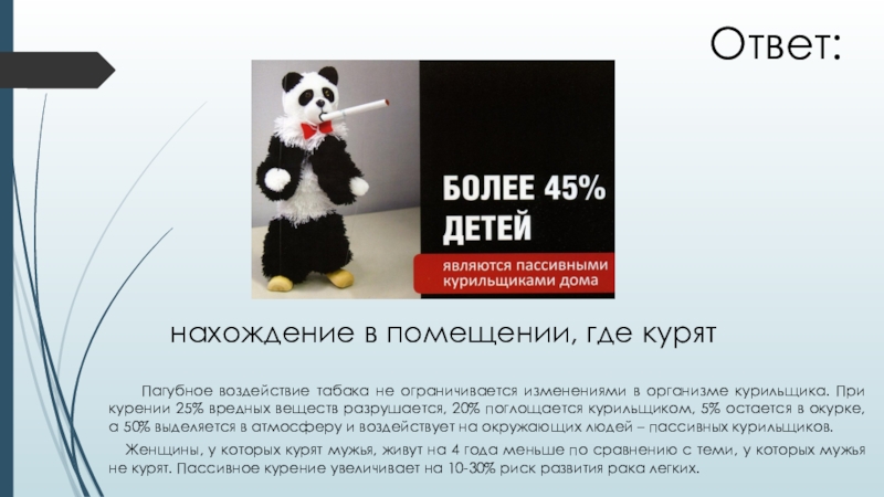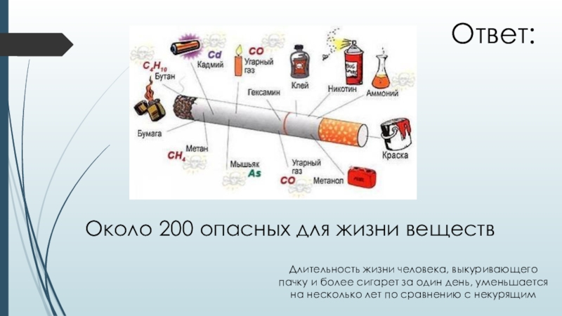 организме курильщика. При курении 25% вредных веществ разрушается, 20% поглощается курильщиком, 5% остается в окурке, а 50% выделяется в атмосферу и воздействует на окружающих людей – пассивных курильщиков.