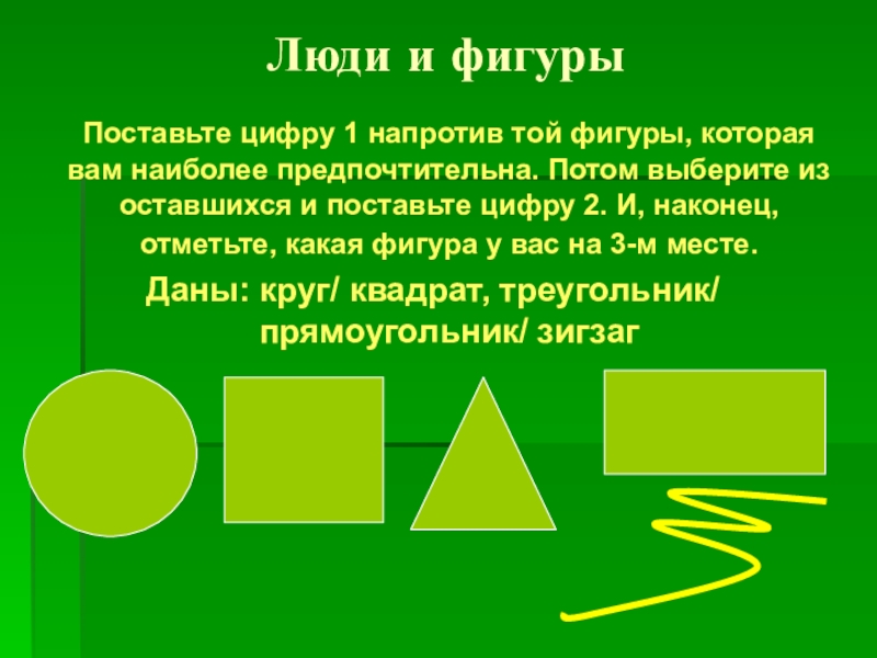 которая вам наиболее предпочтительна. Потом выберите из оставшихся и поставьте цифру 2. И, наконец, отметьте, какая фигура у вас на 3-м месте.