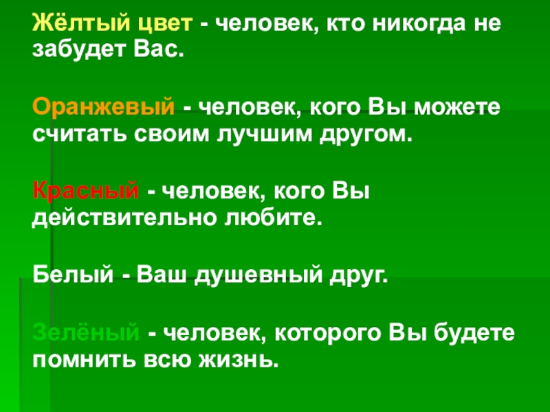 Слайд 14 Жёлтый цвет - человек, кто никогда не забудет Вас.