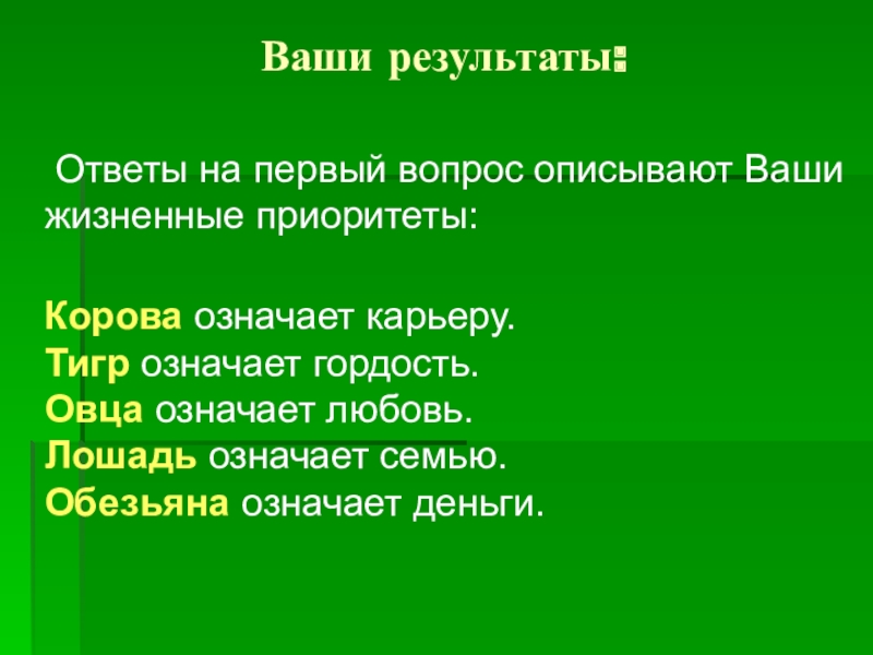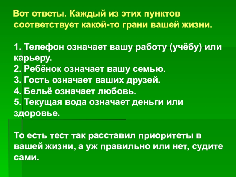 То есть тест так расставил приоритеты в вашей жизни, а уж правильно или нет, судите сами.
