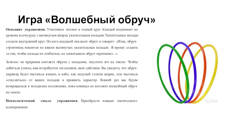Задание: не прерывая контакта обруча с пальцами, опустить его на землю. Чтобы добиться успеха, вам потребуется согласовать свои действия. Вы увидите, что обруч-упрямец будет пытаться взмыть в небо, как надутый гелием шарик, или пытаться «отклеиться» от ваших пальцев и проявить характер. Всякий раз мы будем возвращаться к исходному положению, пока команда не положит волшебный обруч на землю.