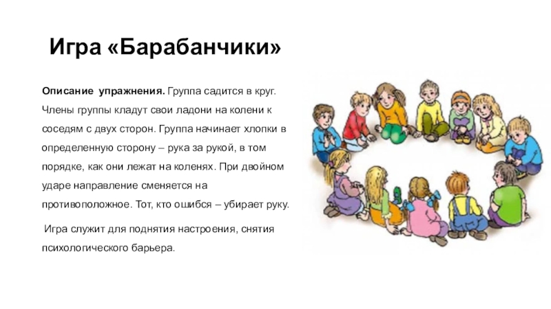 свои ладони на колени к соседям с двух сторон. Группа начинает хлопки в определенную сторону – рука за рукой, в том порядке, как они лежат на коленях. При двойном ударе направление сменяется на противоположное. Тот, кто ошибся – убирает руку.