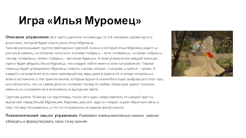 Тренер рассказывает группе свой вариант русской сказки, в которой Илья Муромец видит на распутье камень, на котором написано: «налево пойдешь – коня потеряешь, направо пойдешь – голову потеряешь, прямо пойдешь – женатым будешь». В этом упражнении каждой команде нужно будет убедить Илью Муромца, что следует пойти именно в ее направлении. Первая команда будет уговаривать Муромца поехать налево, вторая – направо, а третья – прямо. У каждого направления есть свои преимущества, ведь даже в варианте «голову потеряешь» можно вспомнить о тех приключениях, которые ждали в сказке богатыря, выбравшего этот путь, или объяснить, что на самом деле он потеряет голову от любви. Командам нужно показать именно их направление в максимально выгодном свете.