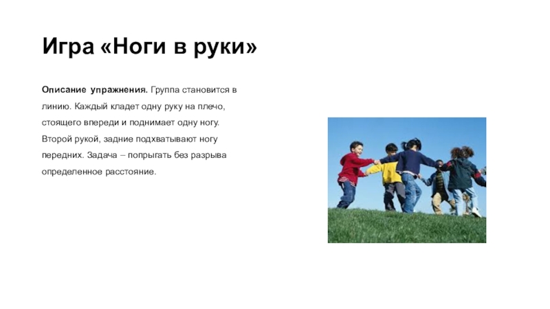 одну руку на плечо, стоящего впереди и поднимает одну ногу. Второй рукой, задние подхватывают ногу передних. Задача – попрыгать без разрыва определенное расстояние.